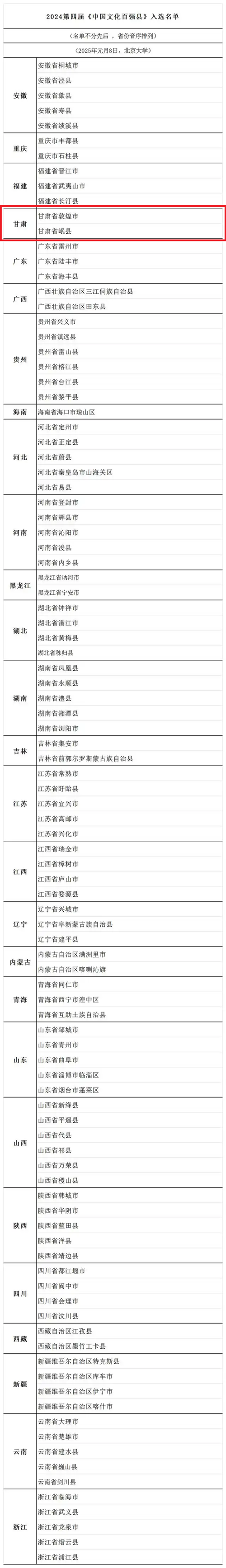 近日,2024(第四届)《中国文化百强县》评选结果在北京揭晓,甘肃省敦煌市、岷县2地入选。
